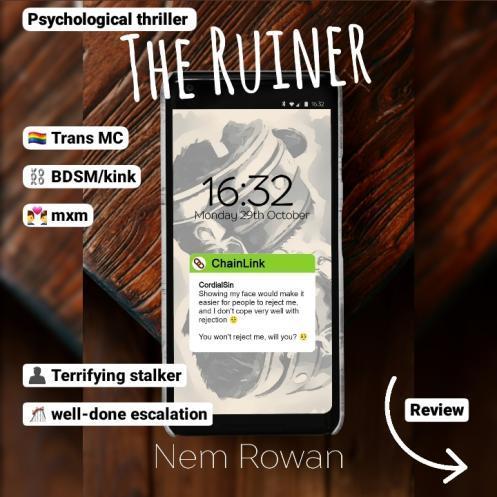 Nem Rowan’s THE RUINER is Gurt Dog’s latest release. It’s a queer thriller romance about a trans MC who gets stalked… and it’s so well done ♡ the setting is kinky with a BDSM club, it’s own voices, I shipped the achillean romance so hard it hurt, and the stalker was truly horrific & terrifying.