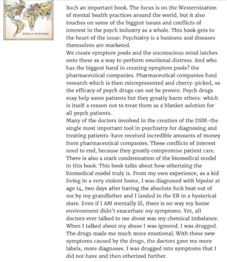 This is such an important book. The focus is on the Westernization of mental health practices around the world, but it also touches on some of the biggest issues and conflicts of interest in the psych industry as a whole. This book gets to the heart of the issue: Psychiatry is a business and diseases themselves are marketed.