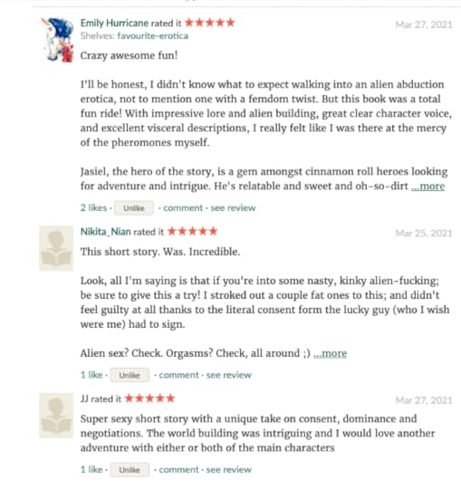 Oh! Let me tell y’all the smutty content included in the alien one (it’s actually far more graphic than anything I’ve written before-so much so that some of my usual beta readers chose to opt out).