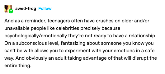 But I think sometimes adults do the same thing. I think parasocial relationships are something that people do when they want to explore an emotion but don’t have a way to explore it in real life, for whatever reason.