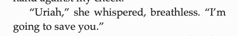 Aria says this in a scene where SHE takes the lead (so you know that scene was already one of my favorites). She pushes him down onto the bed and rips his clothes off, all while Uriah is super turned on by how bold and confident she is, taking charge in the bedroom. Then she looks down at him, as they’re both naked and she’s about to mount him and says ‘Uriah, I’m going to save you.’