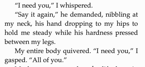 All of that context and the heightened, erotic emotions of the scene, it all just REALLY worked for me. I found it so sexy, so sweet, so romantic. That has got to be my favorite line of sexy dialogue from the whole book.