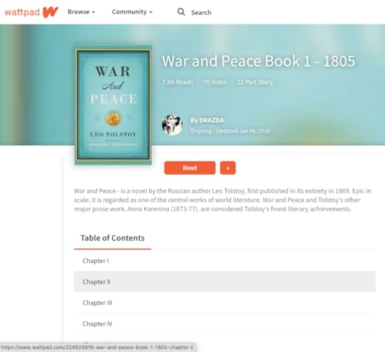 (Also, you can read ‘War and Peace’ on wattpad. You can read almost every classic on wattpad, and the UI is yards ahead of Project Gutenburg. Public Domain, baby.)