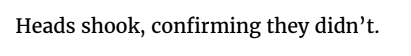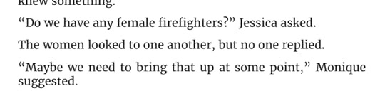 It’s really never a good idea to come right out and TELL the audience how a character feels and this book does it constantly. I mean, the women shook their heads after being asked “Hey, anybody know about this?” Do the readers really need to be told that when they shake their heads they are saying they don’t? It’s a little condescending, frankly.