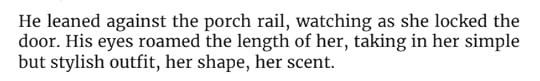 This is a ridiculously creepy image. He’s just leering at her on her porch? And ‘her scent’? Just feels like a phrase that should be uttered somewhere after “Hello, Clarice.” No non-cannibal man is using the phrase her scent on someone’s porch. You have to actively be mid-coitus to stand a chance of uttering that phrase without setting off my serial killer vibes.