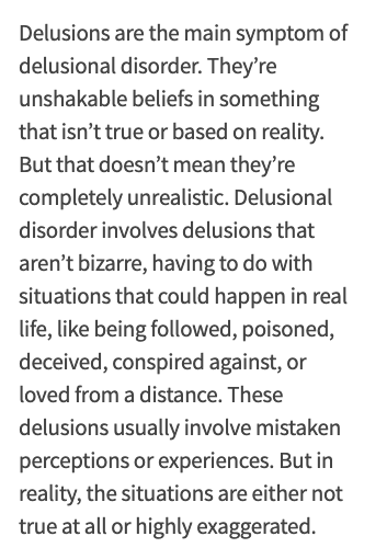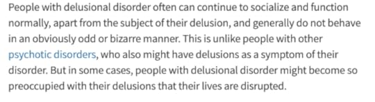My delusions are usually more mild, and just like Web MD says, I’m able to function in my daily life (usually) despite having them. Mild delusions might include me becoming convinced that everybody at work hates me, or me covering my webcam because I’m suddenly convinced hackers are watching me through it. It’s small stuff and I can go about life, battling off these delusions, and most people never realize there are very weird things happening in my head.