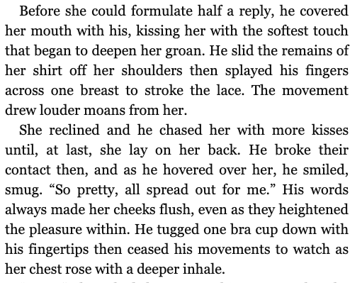 What I rarely seen done in bdsm romance is tender bdsm. Not everybody who is turned on by submission and power games is into pain/humiliation/all the extreme chains and whips stuff. Even for the people who are turned on by the more extreme stuff, that doesn’t mean they want to fantasize about rape/non-con. That’s it’s own subgenre, but unfortunately, it does bleed over into the bdsm subgenre quite a lot. For me, I’m most turned on by bdsm when it’s very tender and sweet.