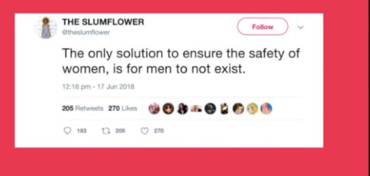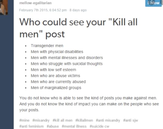 You see, the egalitarians give a shit about men if the men have a victim chip…..but yeah, normalize violence against white, cis, straight, abled men. That’s cool [image error]I’m not even sure how to feel about the casual misandry in the book upon reflection. It actually makes sense that a man trying to capture the female voice would have their character take digs at men, treat male sexuality as creepy/predatory and the female body as some prize to be granted to men who earn it (THAT is feminism and it is why I’m not a feminist).
