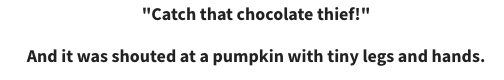 She used that prompt in the most creative way. The story starts with a shifter cop (a cop of the paranormal world in this comical urban fantasy) answering a call about stolen chocolate. The werewolf cop catches a whiff of pumpkin and the witches who put in the complaint automatically know who is responsible for stealing their chocolate. They tell him nevermind. The person responsible is too much of a menace to bother pursuing the case.