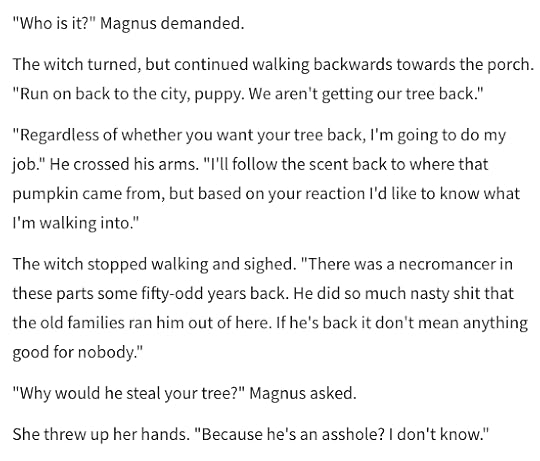 It’s so neat to see the buddy cop subgenre in such a unique, refreshing way. Rather than two men, it’s a man and a woman. And it’s been combined with the paranormal genre! A buddy cop story in an urban fantasy is such a cute idea. I’m loving all the investigation of paranormal crime. It’s not all as innocuous as stolen chocolate. There are is a murder investigation and they have to visit the crime scene. Nyx does her part by fooling around with the Captain (of the human police) so she’s good and distracted while Magnus checks out the CCTV footage of the building. This is actually our first hint that, despite how annoying Magnus finds her, the two of them might actually turn out to be a really great team.
