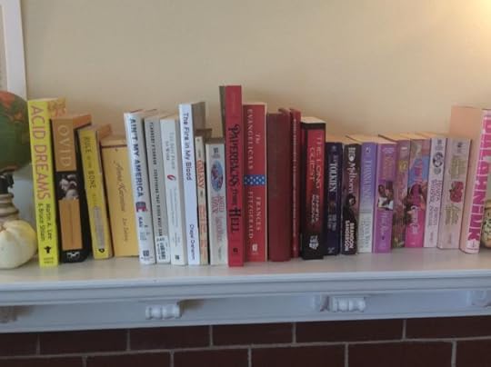 Colors are used as a form of symbolism in the decorations and sugar skulls. Some of the colors used in association with Dia de los Muertos are yellow (unity), white (hope and purity), red (blood and life), purple (mourning), and pink (happiness). Take a photo of some book spines in the Dia de los Muertos colors!
