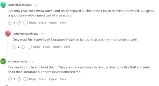 My thoughts are the same. Light spooky story. Classic haunted house, but with the twist of a very happy ending. A lot of people have called her “cozy horror.”