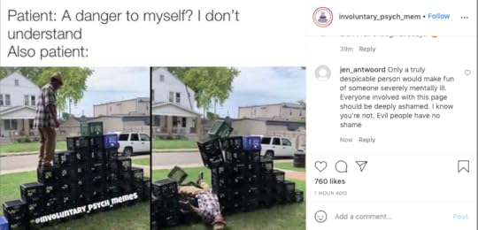 Punching down, making fun of people for mental illness, something they can not help and are likely deeply ashamed of, it is not funny. It is based on the premise that the mentally ill should be mocked. Well….you’re mocking them.