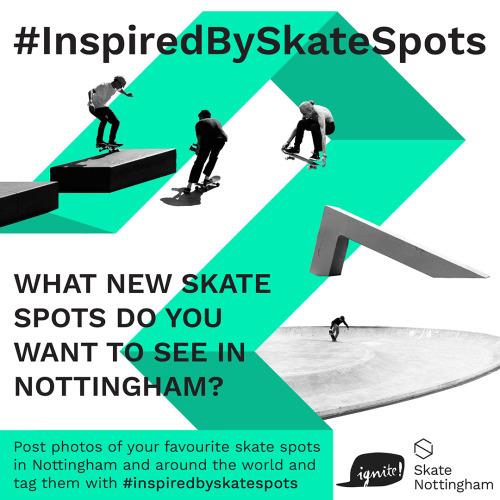 Skate Nottingham has launched a campaign to spread the passion about inspiring spots. They want to introduce new skatespots to the city by the summer of 2021 and they are asking people to send in pictures of the locations that make them excited. So use the hashtag #inspiredbyskatespots and post your muse on Twitter and Instagram.