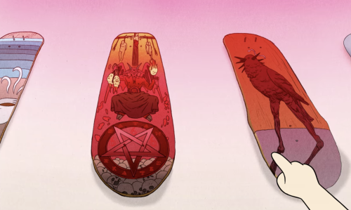 The boutique style skateshop they visit to buy Emily a board is a nod to the minimalist aesthetic of Supreme. Josh is immediately alienated by the vibe of the store and the clean cut staff. Candice picks out a Satanic board from the wall, which is an obvious nod to the Natas 101 board. Emily is freaked out by the dark graphic, but then Josh decides the Satanic board is preferable to the graphic modelled on the store’s ‘pro’ rider’s torso. I of course, with my research interests, relished the acknowledgment of the satanic graphics and the sociophobics of parents navigating such imagery.