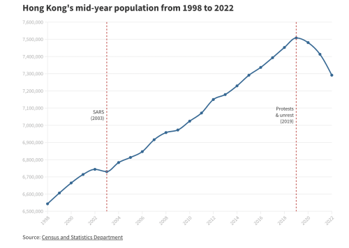 Reports of the impact of the resident exodus in HK Free Press. In terms of demographics this is building a very interesting picture. Not only are people leaving, but new migrants in appear to be slowing too. Hong Kong’s population is now back to 2014 numbers. Nothing paints a more distinct picture of the recent changes than the graph above.