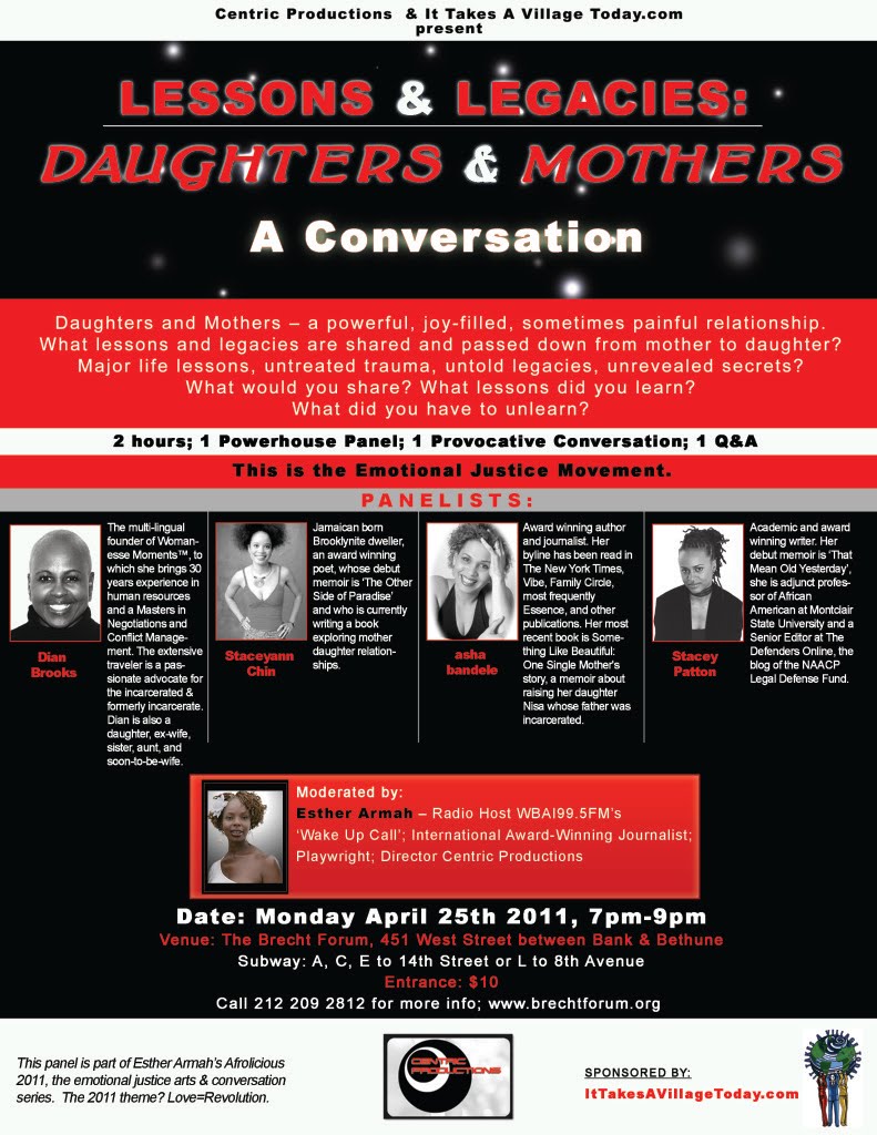 This panel is part of Esther Armah's Afrolicious 2011, the emotional justice arts & conversation series. The 2011 theme? Love=Revolution.