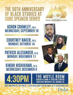 Each month, throughout the 2019-2020 academic year, the department of African & African American Studies will host a lecture by scholars who have been immersed in Black Studies at while at Duke. All of the talks will be held at 4:30 p.m. in the Karsh Center.