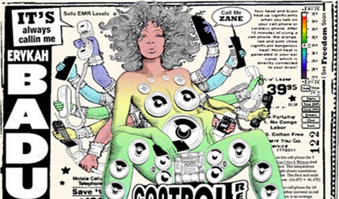 Her new telephone-themed album, But You Cain’t Use My Phone, which she also calls a “mixtape,” manifests this complex relationship to gender at the deeper levels of production and form. Here the self-described “analog girl” creates a layered electronic world, one largely populated by men and filled with male voices. In addition to covering several songs by male artists, Badu features male rappers, collaborates with producer Zach Witnessin, and credits her son Seven with artistic and promotional assistance.