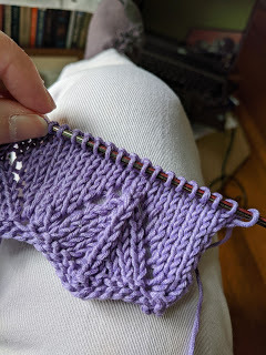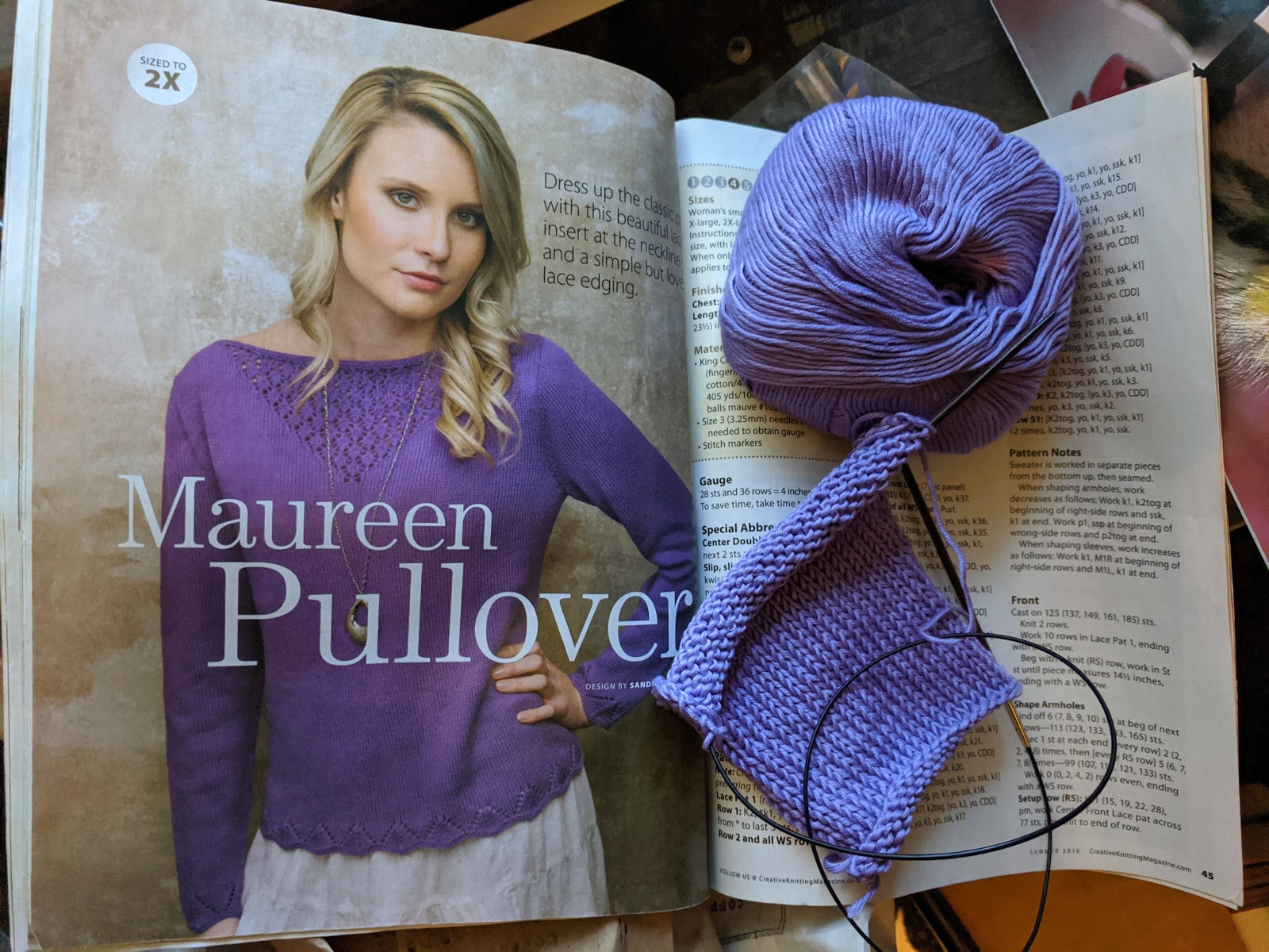 And so, with the help of a colleague, I found a place where I could make an appointment to look at yarn and patterns. I didn't find exactly the kind of pattern I was hoping for (one with an interesting but easy knit-purl design), but I did find a pattern for a simple stockinette stitch pullover with easy knit lace trim. And so it's launched!