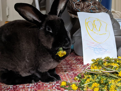 Mikko is extremely fond of dandelions and was quite pleased when a kind neighbor dropped off a sack of them along with an Easter card from her small child. I had hoped Felicia would emerge for the photo session, but while she enjoys dandelions too, she did not feel they merited interrupting her nap.