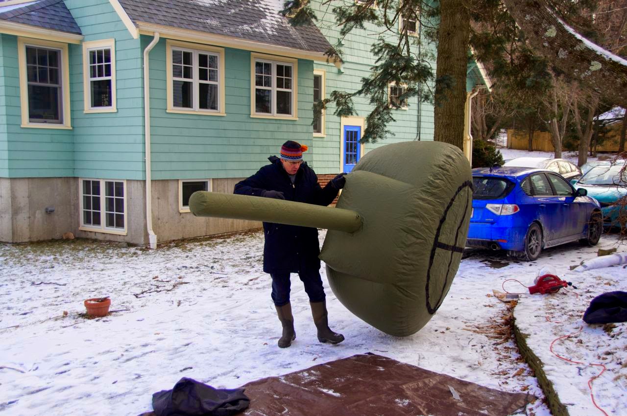 It was so cold the skin of the tank felt hard, almost crunchy. We inflated it using air we piped in from the house, to keep the fabric flexible while it expanded.