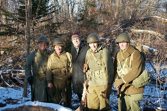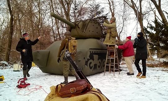 Two weeks ago, with the temperature hovering around ten degrees, we shot a video book trailer for The Ghost Army of World War II, which is being published by Princeton Architectural Press in April. For the opening sequence, we recreated World War II in the back yard.Well, not exactly. But we did shoot a sequence involving our inflatable tank and four WWII Living Historians with incredibly accurate period clothing and equipment. Then we cleared out the living room so videographer Dillard Morrison could shoot interviews with co-authors Liz Sayles and myself.