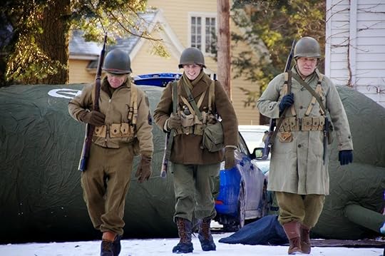 World War II Living Historians Brian, Louis and Tom on the march to the battle of Outlook Drive. We were careful to notify the neighbors so they weren't worried about the appearance of a tank and men with guns in the back yard. They seemed remarkably unfazed.