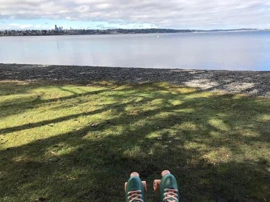 My green and pink skates on the grassy beach at Seward Park, with the lake and city in the distanceHello, friends!