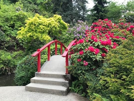 A red bridge surrounded by purple and magenta rhododendronsIn...
