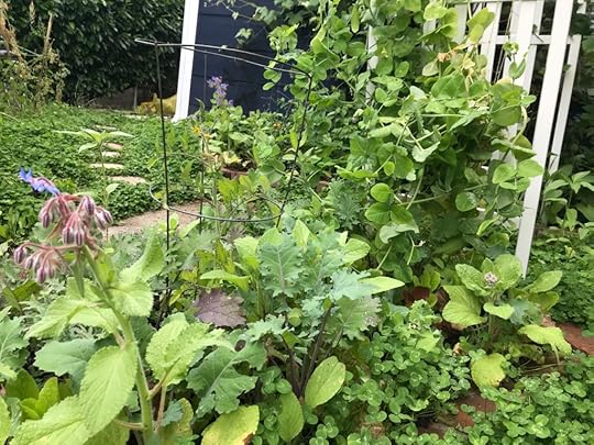 This is my garden. It’s a wild hodgepodge of plants; there are no orderly rows here. Perennial herbs and berries vie for space with annuals like lettuce, snow peas and, always, kale.