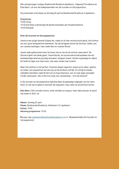 Ik vind het natuurlijk heel leuk als je erbij kan zijn! Stuur om te rsvp’en een mailtje naar apeldoorn@boekhandelbroekhuis.nl onder vermelding van ‘Boekpresentatie De huurster en het poppenhuis’. Hopelijk zie ik je dan!