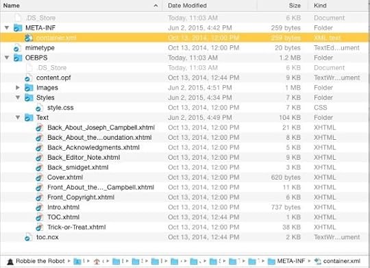 The container.xml file serves one purpose: to tell the ereader where to look for the OPF file — that’s the one called content.opf here. That’s the heart of the ebook. It tells the ereader where to find all of the rest of the files in the ebook, what order to display them in, and what role each item serves (e.g. cover image, table of contents, etc.)