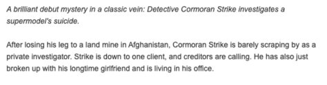 ���After losing his leg to a land mine in Afghanistan, Cormoran Strike is barely scraping by as a private investigator.��� Immediately, I get a sense of who the protagonist is and what he���s struggling with; if I like hard-boiled detective stories (which I happen to), then that tease is definitely going to pull me in.