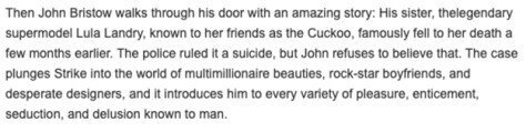 Here���s the hook and tease for the recent bestselling mystery The Cuckoo���s Calling by Robert Galbraith (aka J.K. Rowling):
