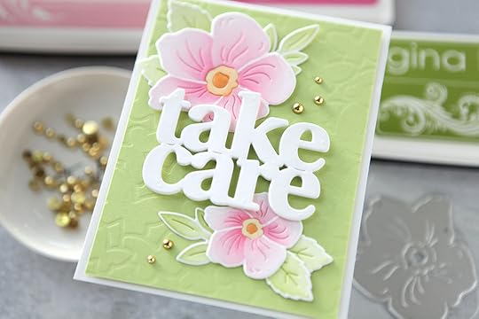 On the Take Care card, I also used the Butterfly Background Stencil to dry emboss that subtle pattern on the pale green cardstock.