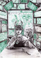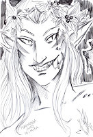 In a room full of screens and radios sits the bejeweled incarnation of chaos, nor man nor woman, not human nor divine. A knife on the table (what it might have been used for?), and a burning book in hand. Of course books, inheritance of a slower world, are not loved by chaos... a cascade of informations: a life that's afraid of silence and boredom. Questo è il terreno di caccia di un mutatis.ORIGINS Mutatis are the youngest of the seven species of greater demons, originated by the union of luciferians and fae. p { margin-bottom: 0.25cm; line-height: 115%; background: transparent }a:link { color: #000080; so-language: zxx; text-decoration: underline }Despite being the most recent out of the seven, their magical prowess and the affinity to luciferians (which have been considered as the "prince species" of Hell for most of the infernal eras) places them rather high in the demonic hyerarchies; even above carnalis demons, even though they derive from the fall of the same angels and are quite more ancient than mutatis are. Regardless of the influence coming from an "external" species, mutatis are considered to be infernal creatures in their own right.