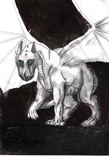 White dragons are of average size, covered in scales that are generally very light in color. They can sport scales that are colored in pale golden, cream and even peach, but the coloration that's more common in this race, as well as exclusive to it, it's total white that makes white dragons look like living marble statues. The horns, that extend behind the head following the line traced by the forehead, are smooth and black, creating a strong contrast with the color of the rest of the body. They can have a third horn placed between the nostrils, but in females it's mostly just a black-colored plate.