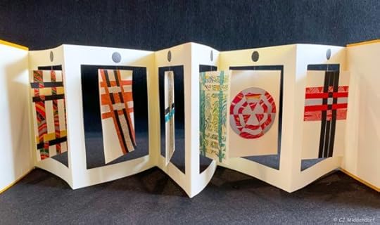 CJ Middendorf participated in my Weave Through Winter online class and shared this book she created recently in The Paper Studio (my free facebook group). There are two back-to-back weavings on each spinning panel in this accordion book. Wowza!