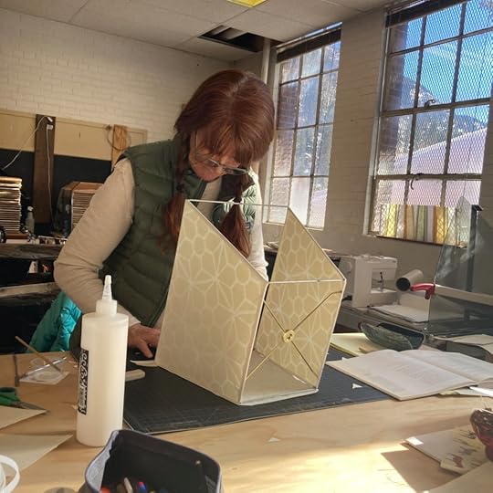 In the Studio:My friend and fellow paper lover Berneil came up to the studio a few weeks ago to make a lamp under my guidance. She used my watermarked star paper (which she purchased at my last paper sale) and it looks so good illuminated!