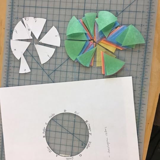 I am nearing completion of my next artist’s book, Prism. It’s been fun doing research about color and light (not to mention making over 600 sheets of handmade paper. Okay. Not so fun). Did you know that Isaac Newton discovered the color spectrum by watching light filter through a prism? And he came up with seven colors in the rainbow because he thought they related to the octave in music. I’ve created a few more colors in between the seven hues, for a total of 24. This image shows Newton’s color wheel (disassembled) in my quest for the perfect cover for my book. Stay tuned!