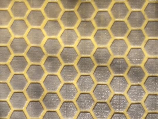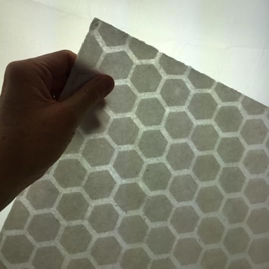 I know I showed you this honeycomb watermarked paper last week, but I can’t get enough of it. I’m making five colorways for my upcoming paper sale (it begins next Sunday, so make sure you read the blog if you need some paper). In case you’re interested, here’s what went into making this paper, which you’re viewing wet and freshly couched. I created a stencil/watermark pattern in Adobe Illustrator (with the help of a designer) that I had cut in a thin rubber material with an adhesive backing. I placed the resulting stencil on a 12″ x 18″ mould. I prepared two batches of pulp: one coarsely beaten cotton linter that I mixed a bit of beaten abaca into for strength and pigmented yellow; and another batch of finely beaten cotton linter that I pigmented with a silver metallic pigment (it had a bit of metallic sheen when wet, and I’m curious to see how it looks when it dries). I pulled a sheet of the plain yellow paper on my other 12″ x 18″ mould, couched it, and then pulled a very thin sheet of the silver paper with the watermark – the pulp slipped off of the stencil and into the hexagons. I then couched the silver sheet on top of the yellow sheet.