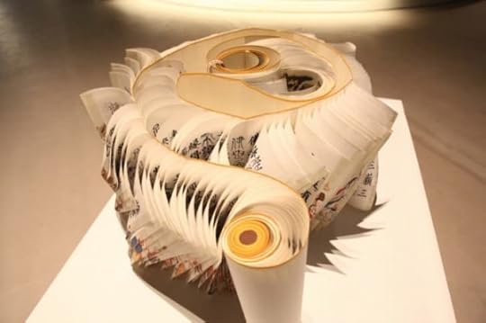 I’ve never heard of the endangered art called dragon scale bookbinding, but Chinese artist Zhang Xiaodong (who decided to research and revive it) layers hundreds of sheets of thin paper on top of one another until they form a complete and impeccable image. When the chapters of his elaborate books are unfolded, the pages move like the bellows of an accordion. It seems a bit like European foredge painting.