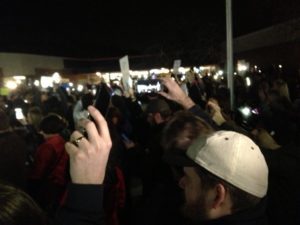 The moment that really defined the protest for me came after I’d been standing in the dark for about forty minutes. The sun had gone down and the building had only a few lights that where completely inadequate to provide light for the crowd. Suddenly it was as light as if someone had remembered where the light switch was an turned it on. I looked up and realized that a large portion of the crowd was holding up their cellphones in flashlight mode. I’m a short person and I wasn’t able to get a really good angle on the crowd, but I tried. The picture does not do the experience justice.