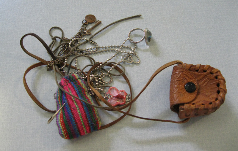 Here are Gleek's talismans. The stripped bag is full of tiny Guatemalan worry dolls. She got them from her grandmother. At least one of the necklaces is a mood ring. The leather pouch contains the instructions for it. I think if you untangle all those other chains, you find that there are four or five necklaces. They're all sturdy, which is necessary considering that Gleek doesn't slow down for jewelry. She has worn them constantly for several years. When she took the pouch and worry dolls off at her cousin's house to jump on a trampoline, then accidentally left them behind, it was a catastrophe of epic proportions. She fretted and made multiple phone calls until the necklaces were found and promises to mail them were extracted. Gleek needed her talismans.