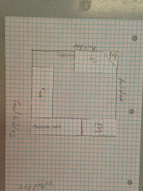 I make little papers to represent tables and furniture. Then I slide them around until I’m happy with the configuration. Once I’m at the booth it is just a matter of putting the tables where I pictured them.