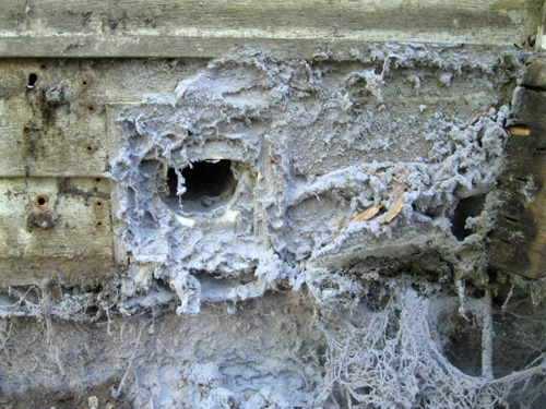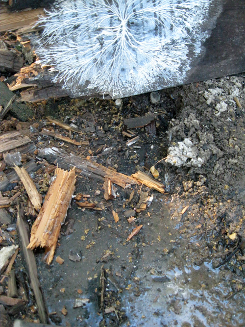 More specifically, there had been a slight divot in the ground underneath a major support beam. Overflow from the sprinklers had run into it until there was standing water. You can see the water more clearly after we’d cleared away the debris. That metal bracket in the foreground of the picture is what held the support beam in place.