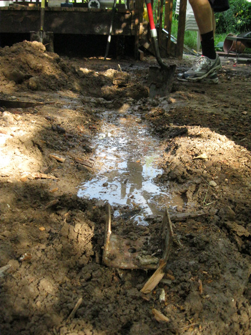 I made sure I was outside working before the crew was due to arrive. I wanted to get the last bits off of the house before they arrived because I wanted to be sure that we did as little damage to the siding as possible. While I’m certain that teenage boys would be happy to wield the crowbar, I wasn’t so sure how carefully they’d approach the task. I’d barely stepped outside when I noticed something interesting. The sprinklers had run during the night and our work site now had a wet canal running through it.