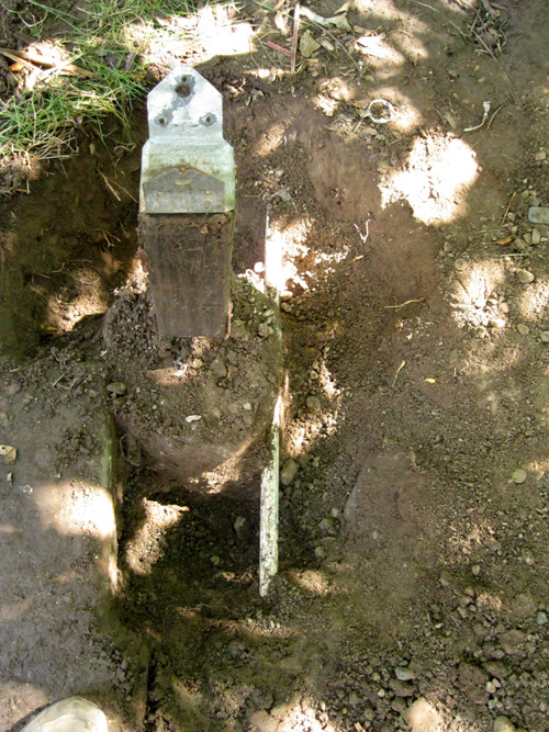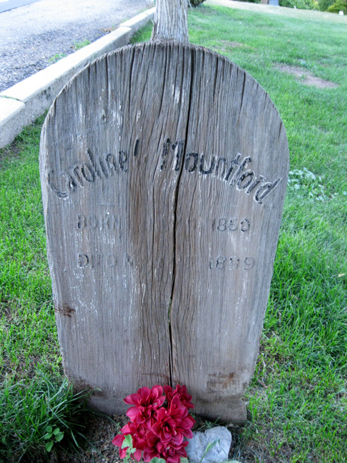 This other wooden marker is about the same age. It is sheltered by a tree, which may be why it continues to stand.