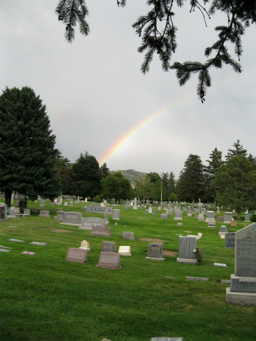I have a friend who often goes for walks in the Salt Lake City cemetery. I’ve seen her posts and it piqued my curiosity about the place, so I asked if I could walk with her one day. She said “Of course.” So we set forth one evening. The weather was a beautiful summer evening with a storm blowing in to cool the air. We had both rumbles of thunder and a rainbow.